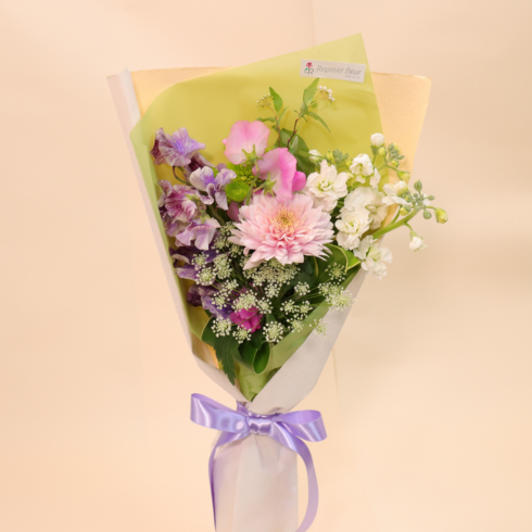 柔らかな春のお花を優しい色合いで束ねたお供えにおすすめのブーケです。